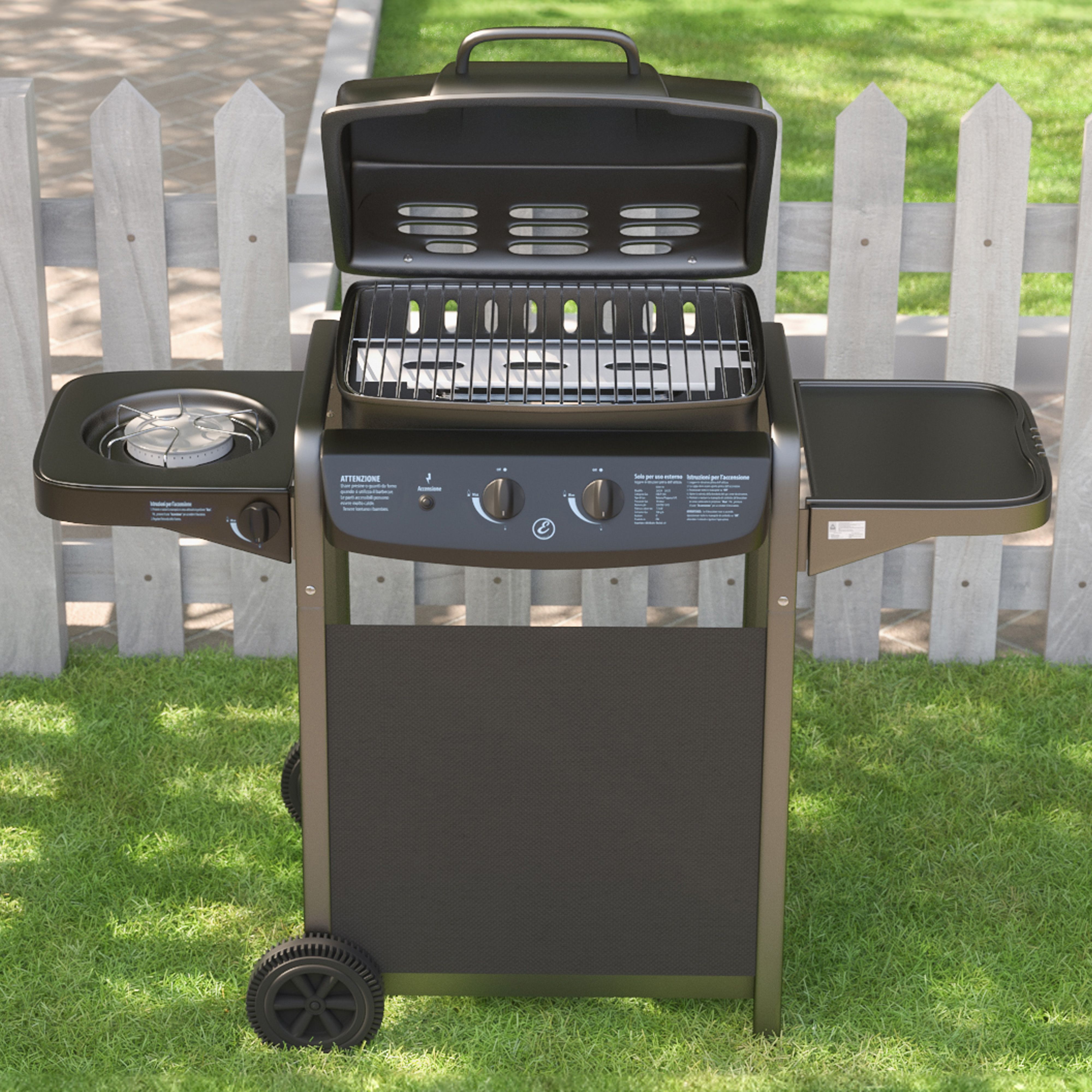 Barbecue A Gas Con Fuoco Bruciatore Laterale BBQ Con Coperchio Termometro Griglia Piano Di Appoggio Grill Compatto Con Ruote e Struttura In Acciaio Giardino Esterno Piscina